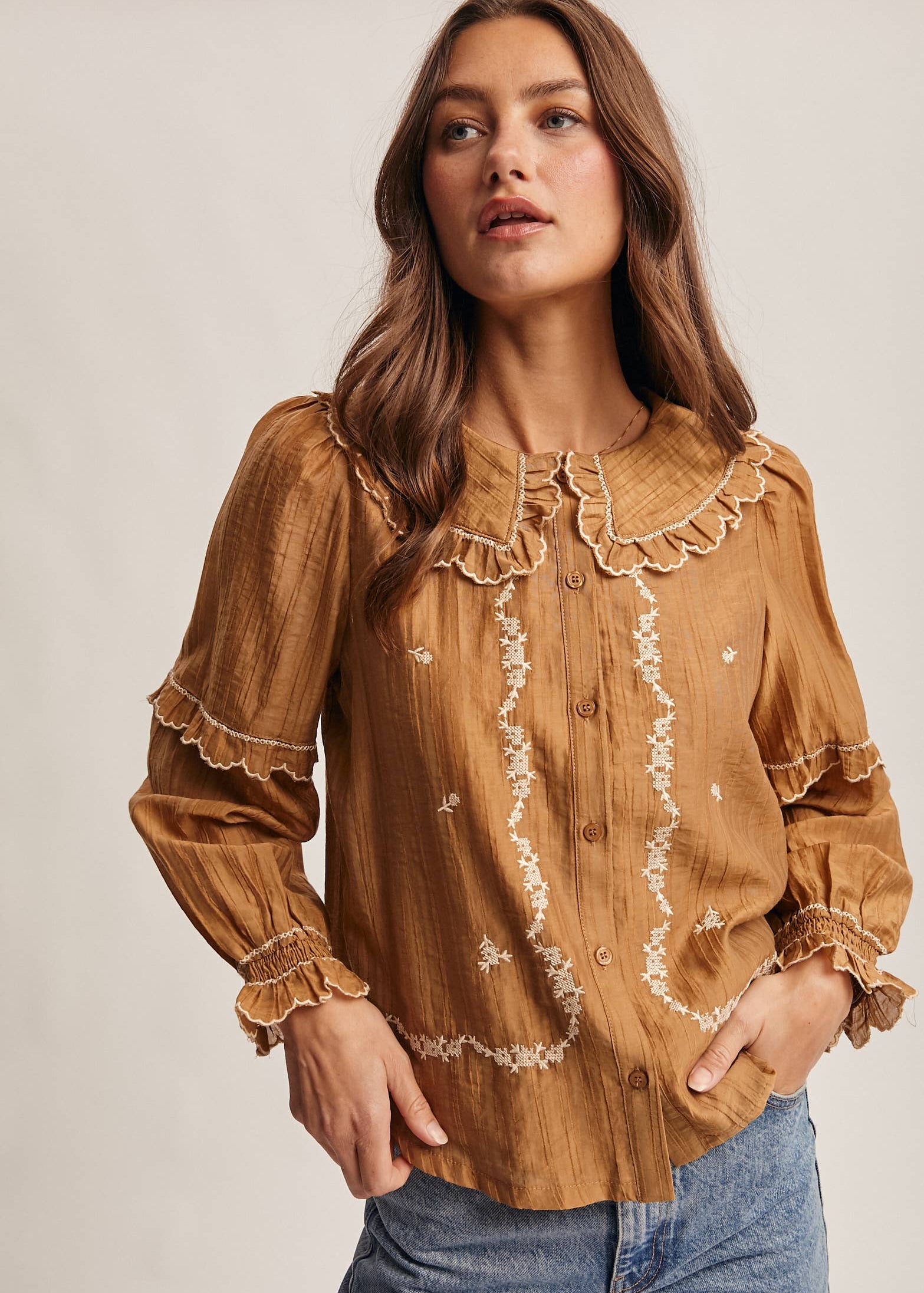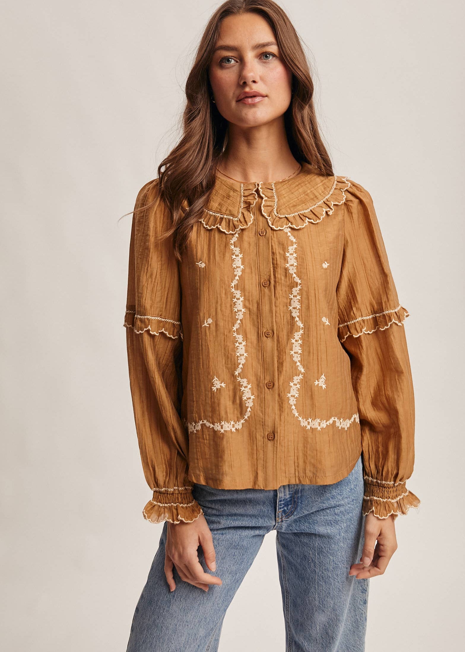 Embroidered Ruffle Collar Cotton Blouse