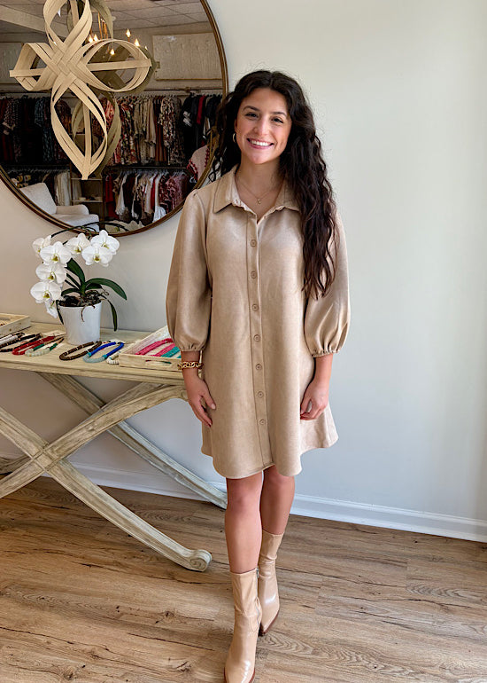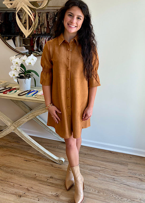 Faux Suede Puff Sleeve Dress in Coffee