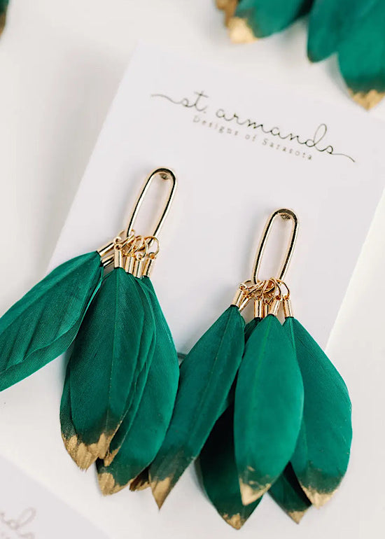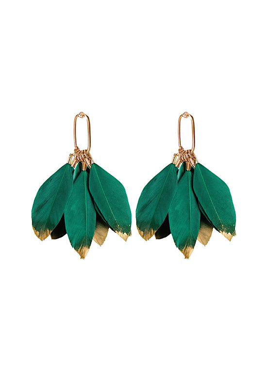 Emerald Gold Dipped Fall Feather Tassel Statement Earrings