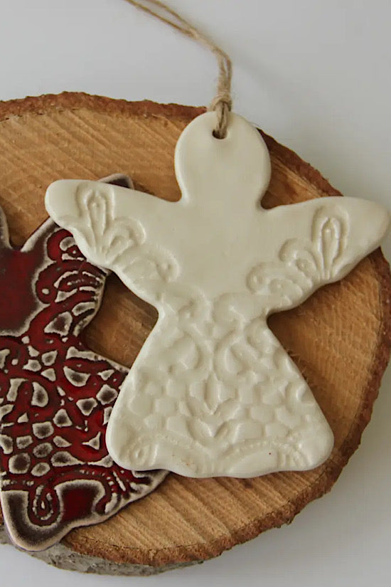 handmade angel ornament • features imprinted angel • perfect gift for the loved ones in your life • measures 4" wide, 5" tall. • tied with twine for easy hanging