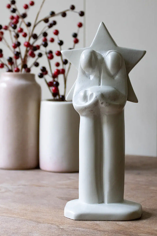 This nativity is a fair trade product handmade in Kenya. The piece was hand carved out of stone, sanded until smooth, then polished. Sold Individually. Stands approximately 6 inches tall. Since this nativity shows the natural colors of the stone, some color variations should be expected. One can often see shades of cream, gray, pink, and brown in the design.