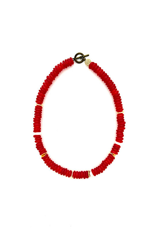 This necklace features red saucer glass beads.  The necklace measures approximately 18 inches long.