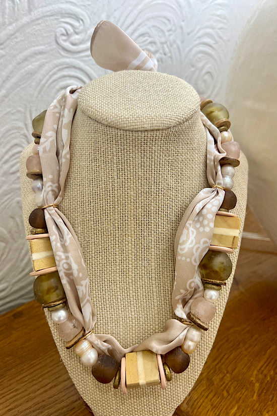 The beaded bandana necklace is designed using ultra soft blocked printed bandanas. Carefully cut down and hand tied to create a comfortable style with a bold look. Each piece is interwoven with staple beads and tied onto a brass snap closure.