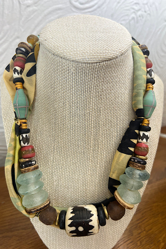 The beaded bandana necklace is designed using ultra soft blocked printed bandanas. Carefully cut down and hand tied to create a comfortable style with a bold look. Each piece is interwoven with staple beads and tied onto a brass snap closure.