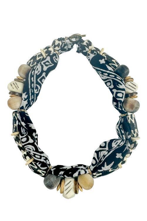 The beaded bandana necklace is designed using ultra soft blocked printed bandanas. Carefully cut down and hand tied to create a comfortable style with a bold look. Each piece is interwoven with staple beads and tied onto a brass snap closure.