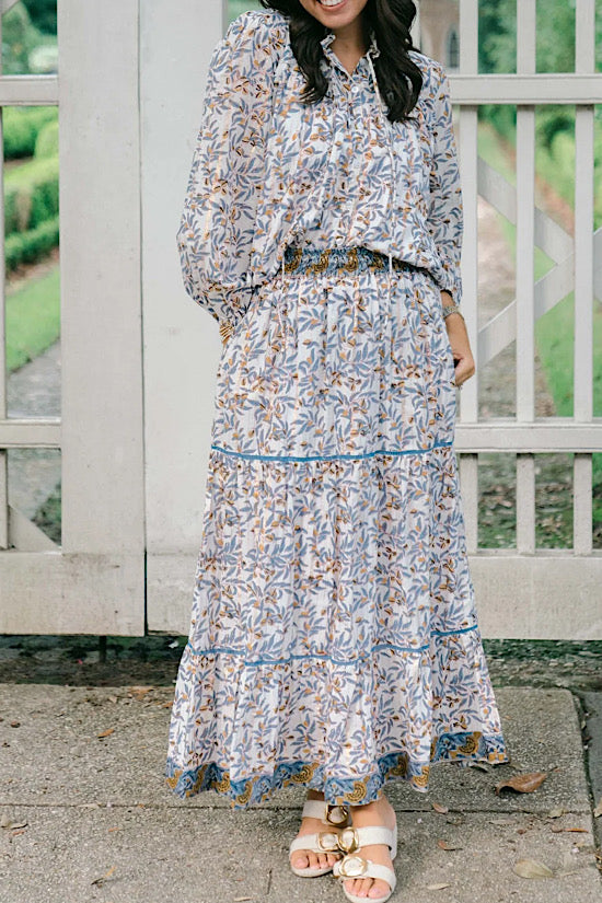 The Lana Skirt features an elastic waistband, a tiered skirt, and contrasting trim. Pair it with our Sage Blouse for the perfect fall ensemble.