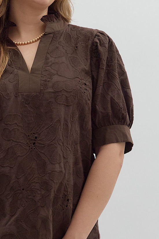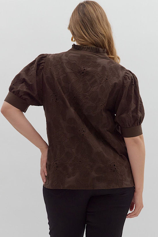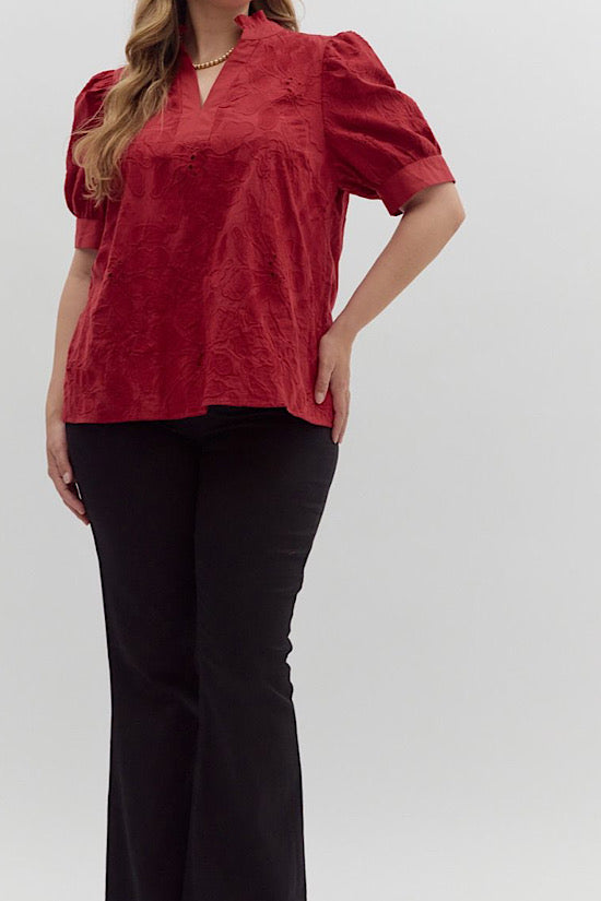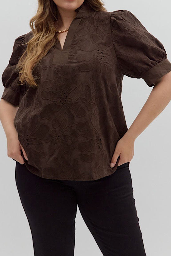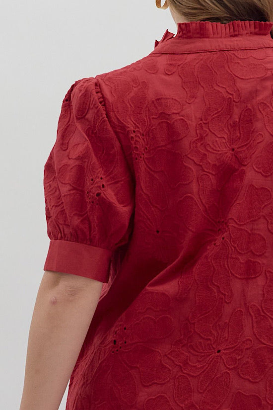 Floral embroidered short puff sleeve pullover top featuring pleated band collar split V-neck. Lined. Woven. Non-sheer. Lightweight.