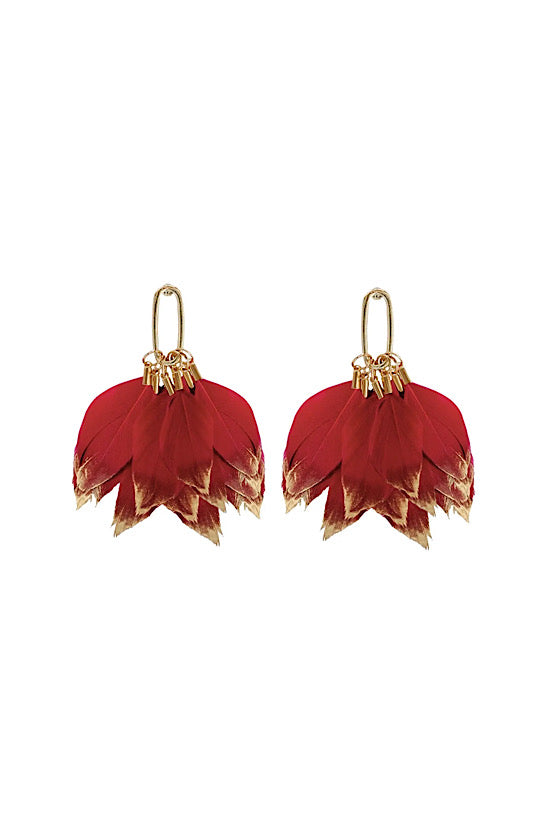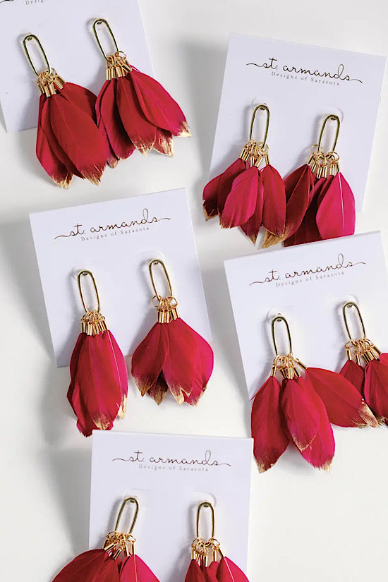New for 2023, we present the newest addition to our fall feather statement earring family! Our hand-selected garnet feathers are dipped in gold accent then combined with gold hardware for a touch of stunning glamour! The lightweight design ensures comfortable wear while the approximately 2.5-inch length adds an elegant touch!
