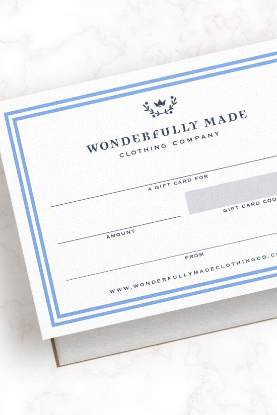 Shopping for someone else but not sure what to give them? Give them the gift of choice with a Wonderfully Made Clothing Co. gift card.