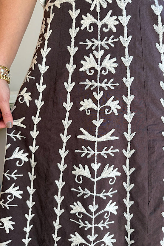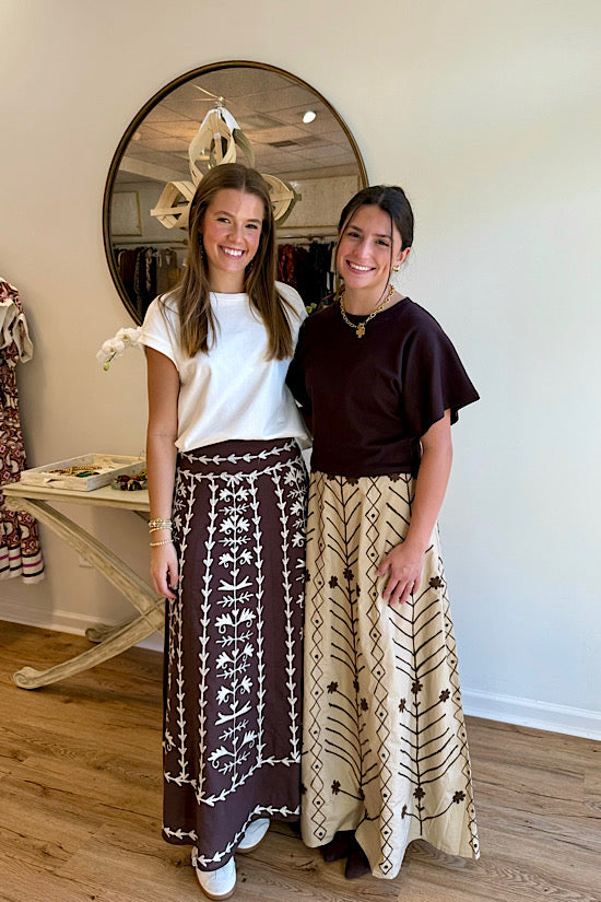 A super flattering and comfy midi skirt with brown embroidery, elastic back, and side zipper. Made from 100% cotton.