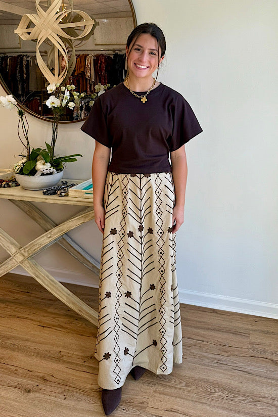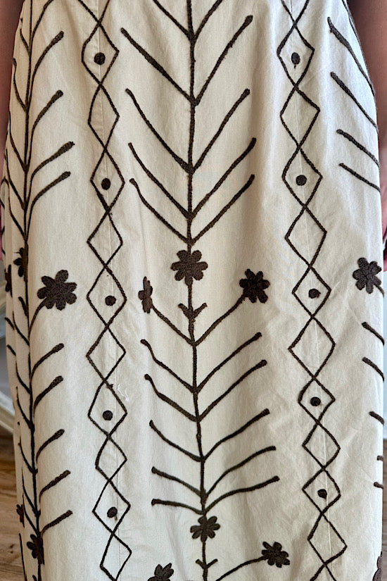 Madison Matthews Hanley Midi Skirt Khaki with Brown Embroidery