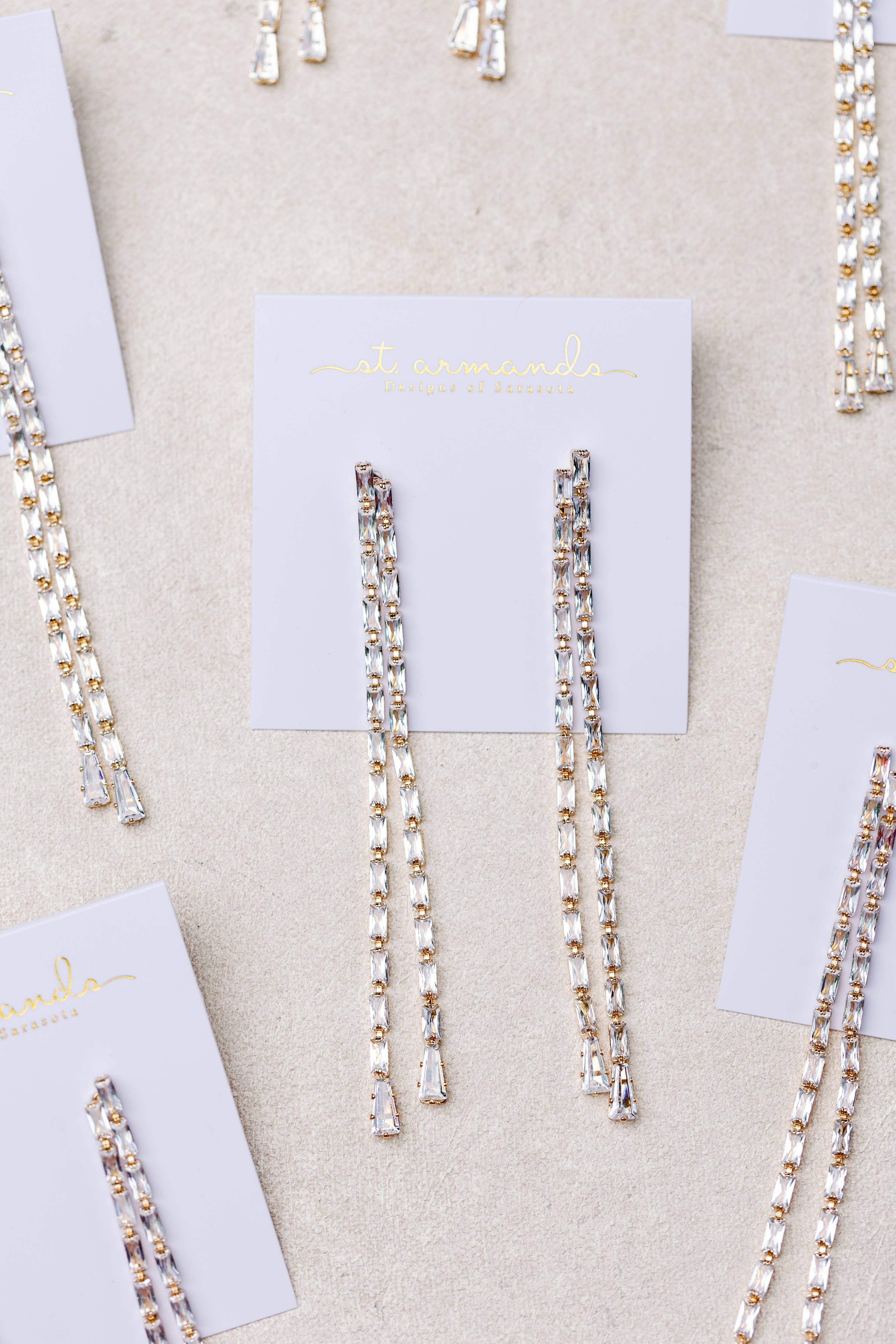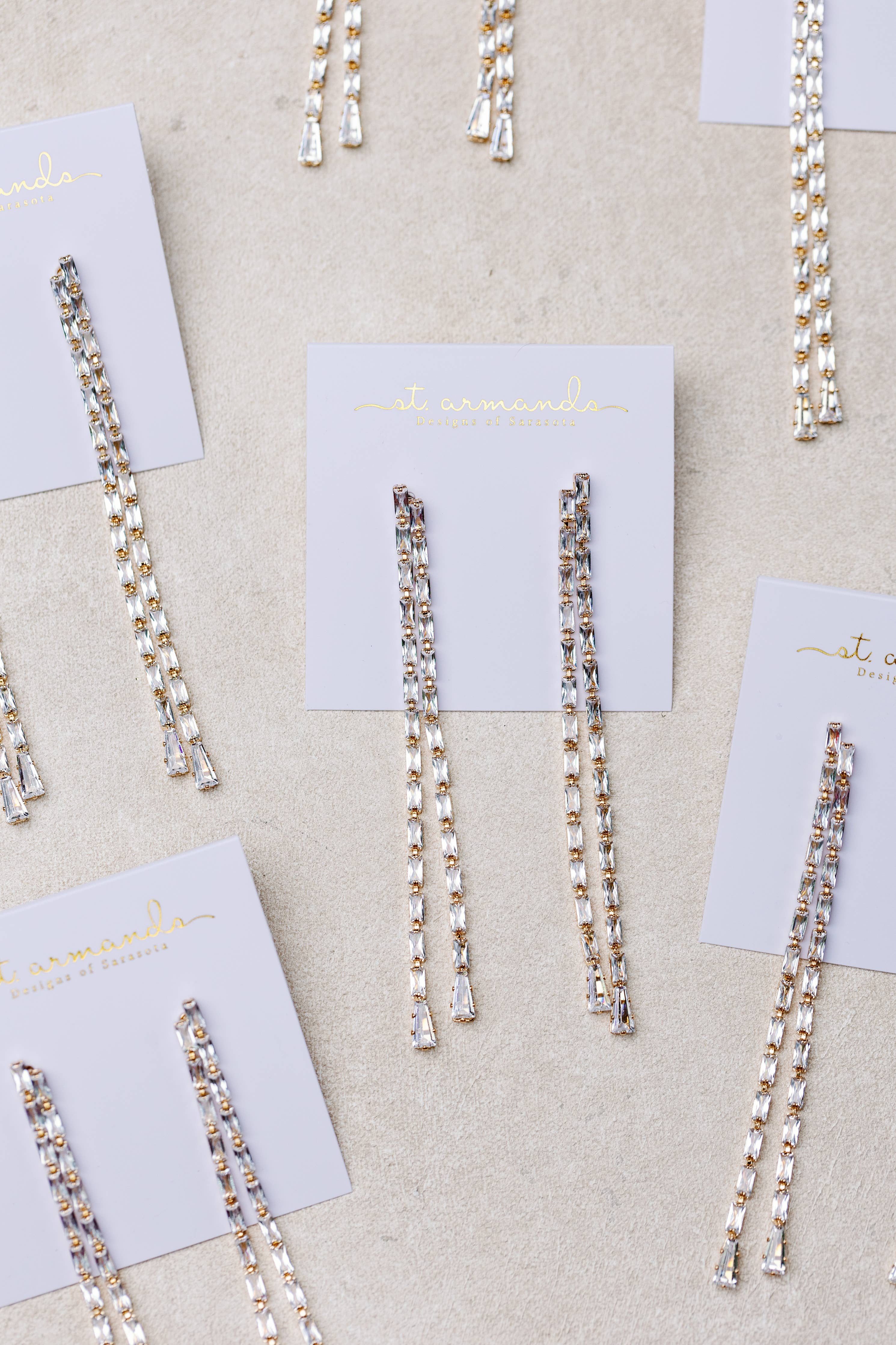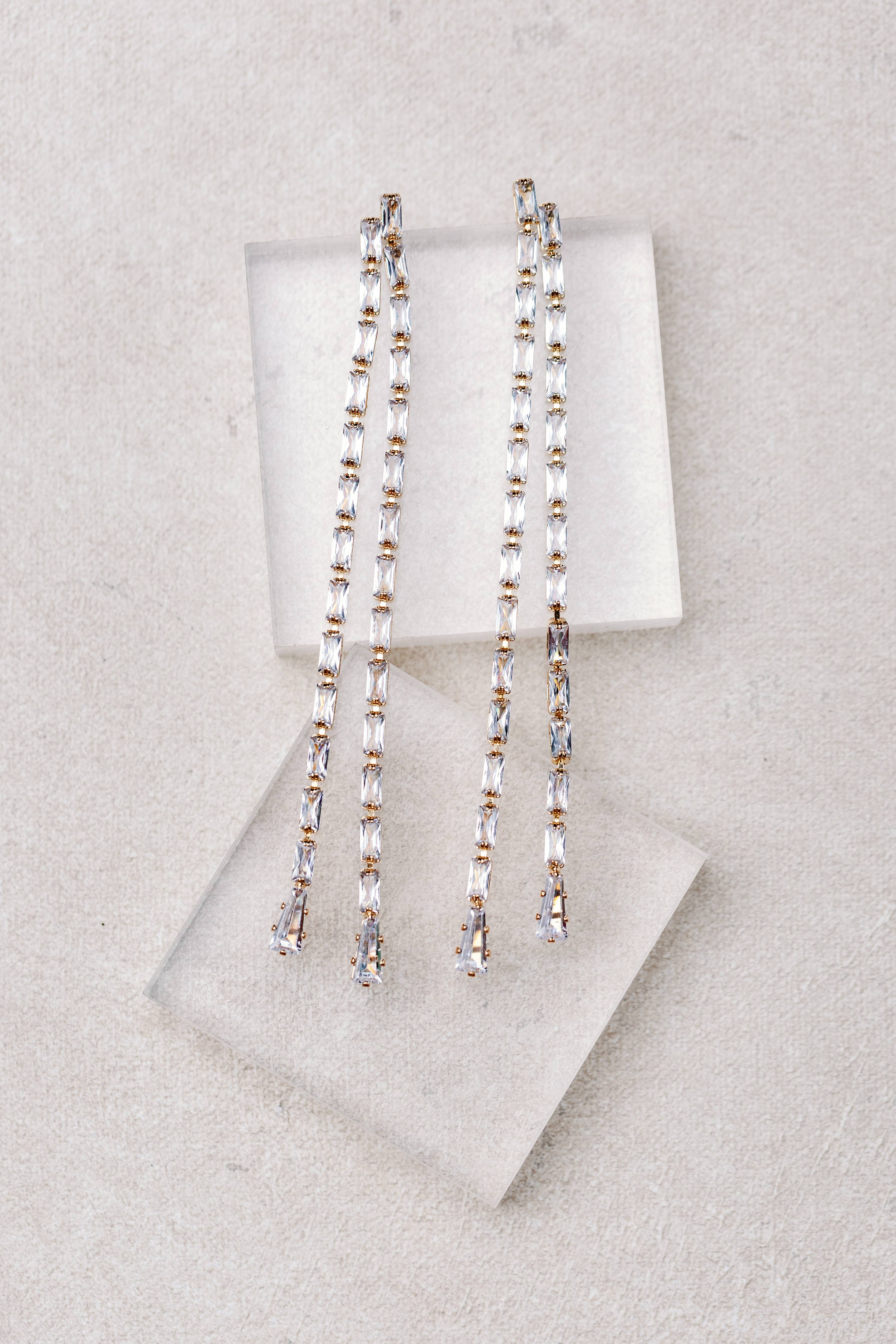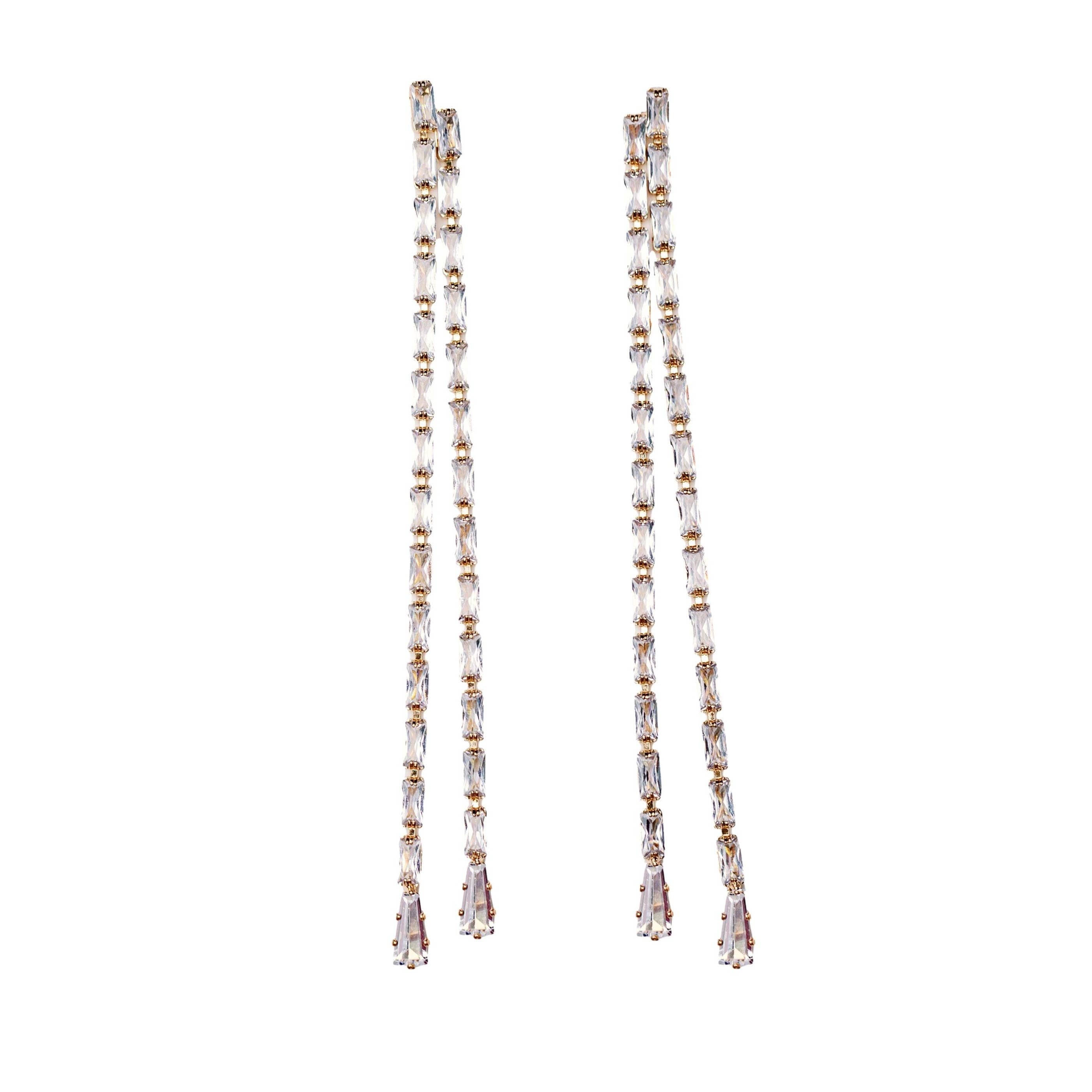 New for Christmas and holiday, our elegant diamond tennis style duster statement earrings feature two interlocking strands that swing gracefully with every movement. These sophisticated earrings add a touch of glamour to any outfit, perfect for the holidays, weddings and special occasions!