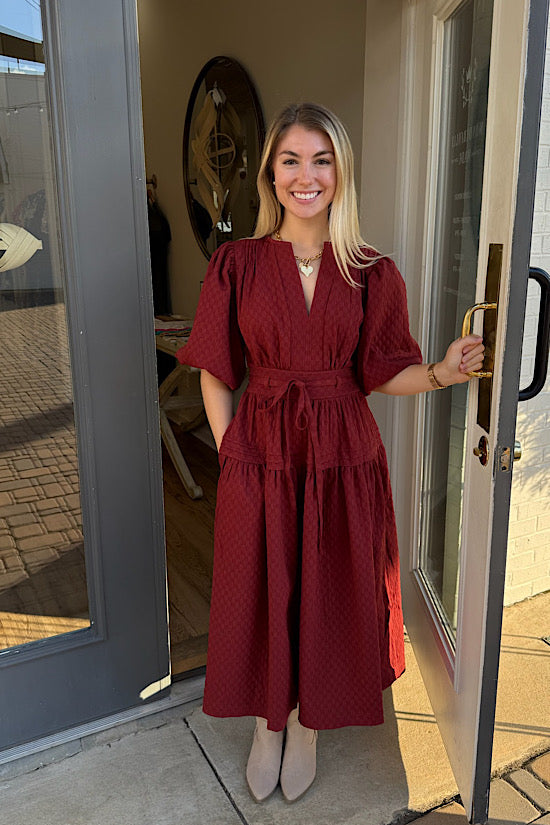 Textured Woven Bubble Sleeve Midi Dress in Crimson