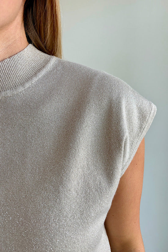 A cozy beige knit top with subtle lurex shine, made from a soft blend of 50% viscose, 25% polyester, and 25% nylon for comfort and stretch. Perfect for adding a touch of sparkle to your everyday look.