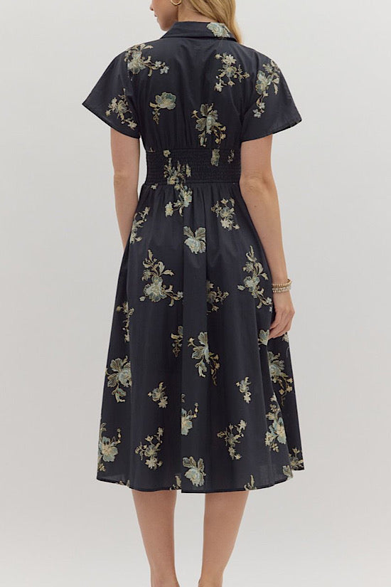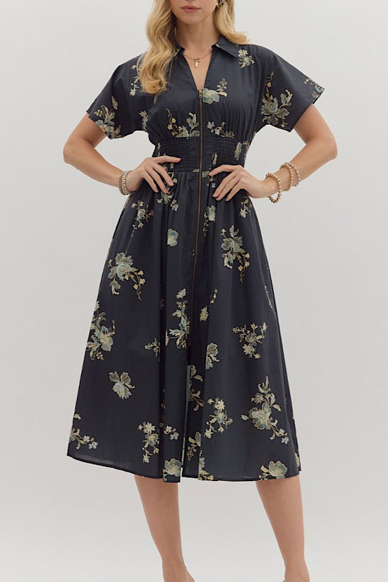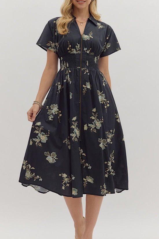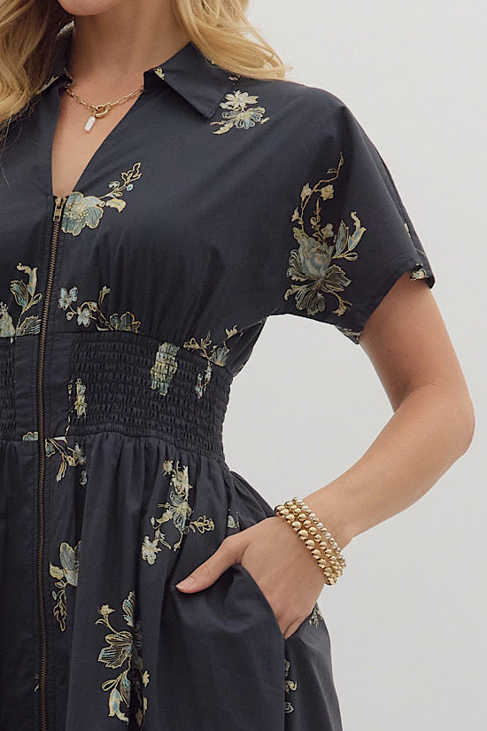 Paisley print short sleeve mini dress. Smocked waistband with full front zip closure. Side pockets. Lined. Woven. Non-sheer. Lightweight.