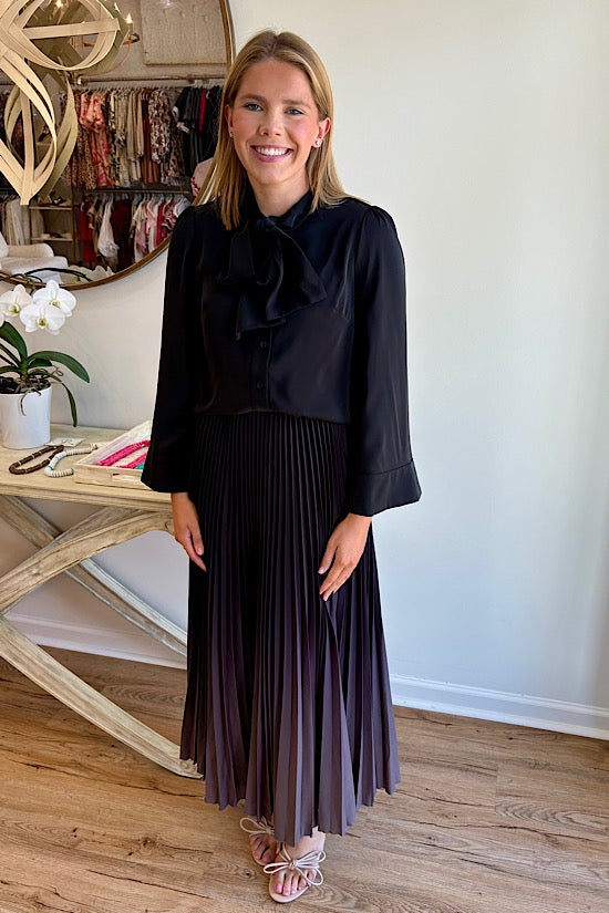 This black top features a tie around the neck for a stylish touch. Made from 100% polyester, it’s soft, comfortable, and easy to wear!