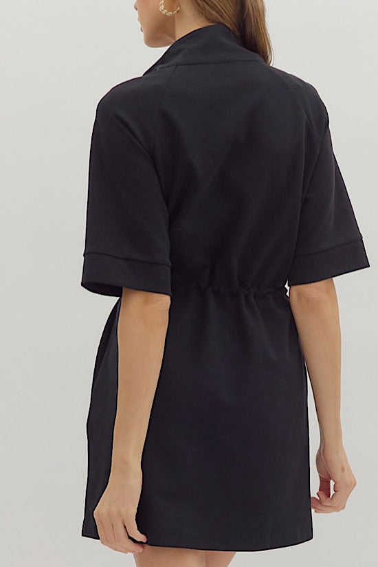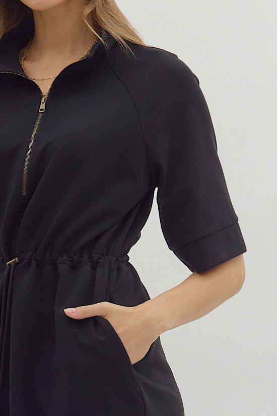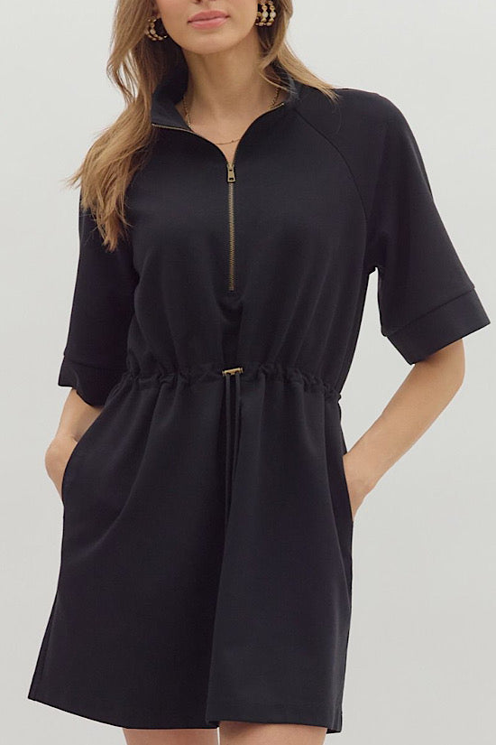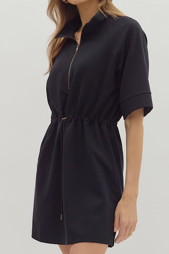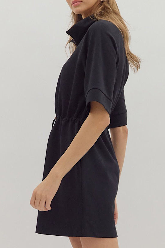 Solid short sleeve zip-front high neck closure pullover mini dress featuring adjustable drawstring at waist. Side pockets. Unlined. Knit. Non-sheer. Lightweight.