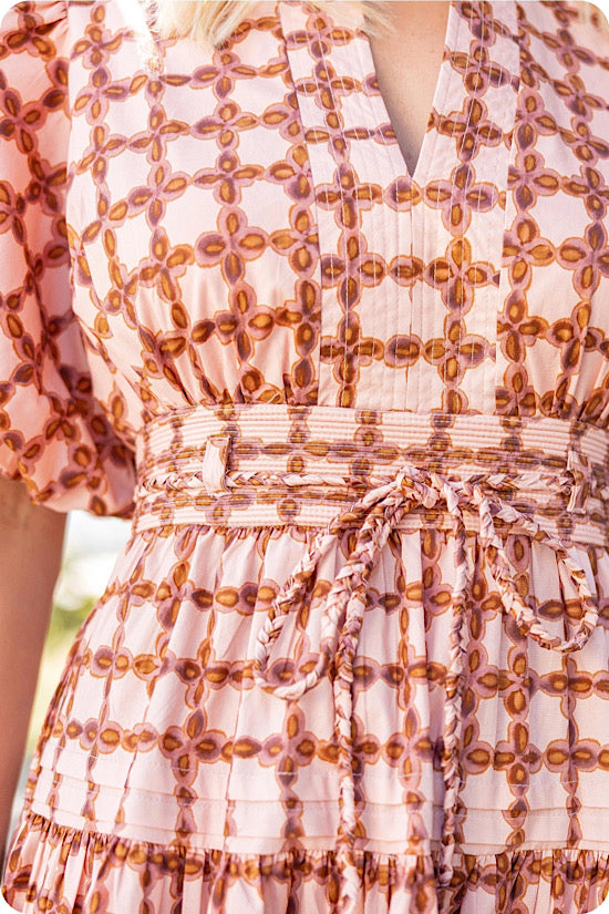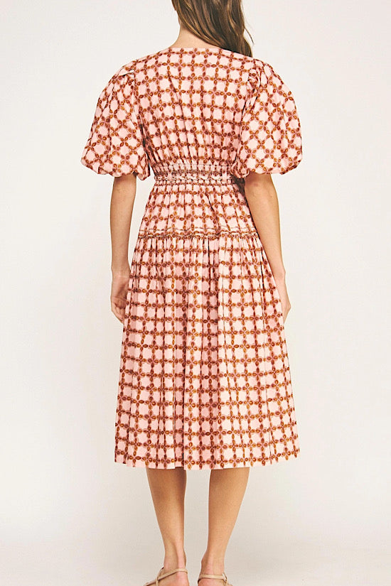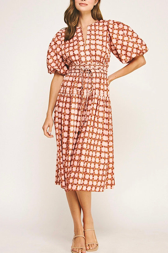 The Chainlink Printed Puff Sleeve Midi Dress in Pink