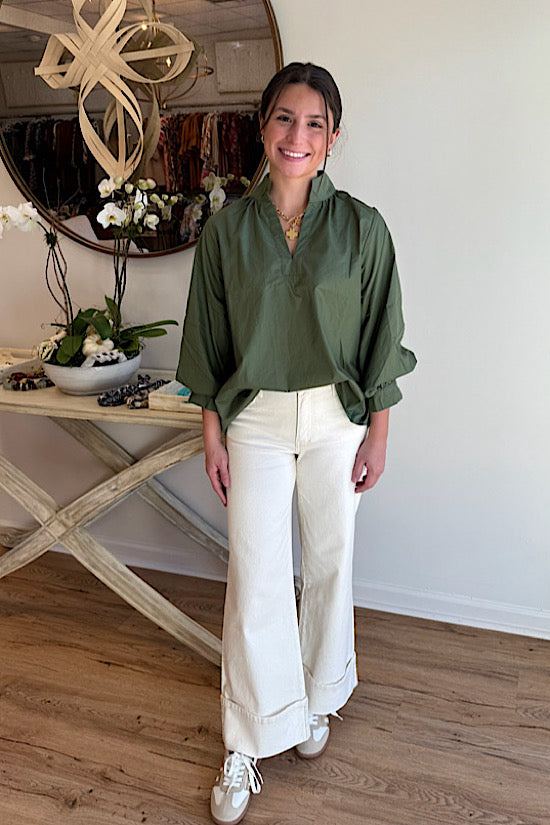 We love this timeless, everyday olive top — featuring a flattering V-neck and three-quarter sleeves! 80% polyester, 20% cotton blend.