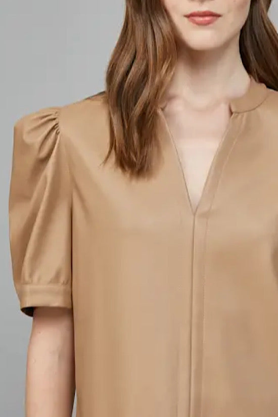 We love this short-sleeve V-neck top made from soft faux leather with a cotton lining. Easy to wear and stylish!