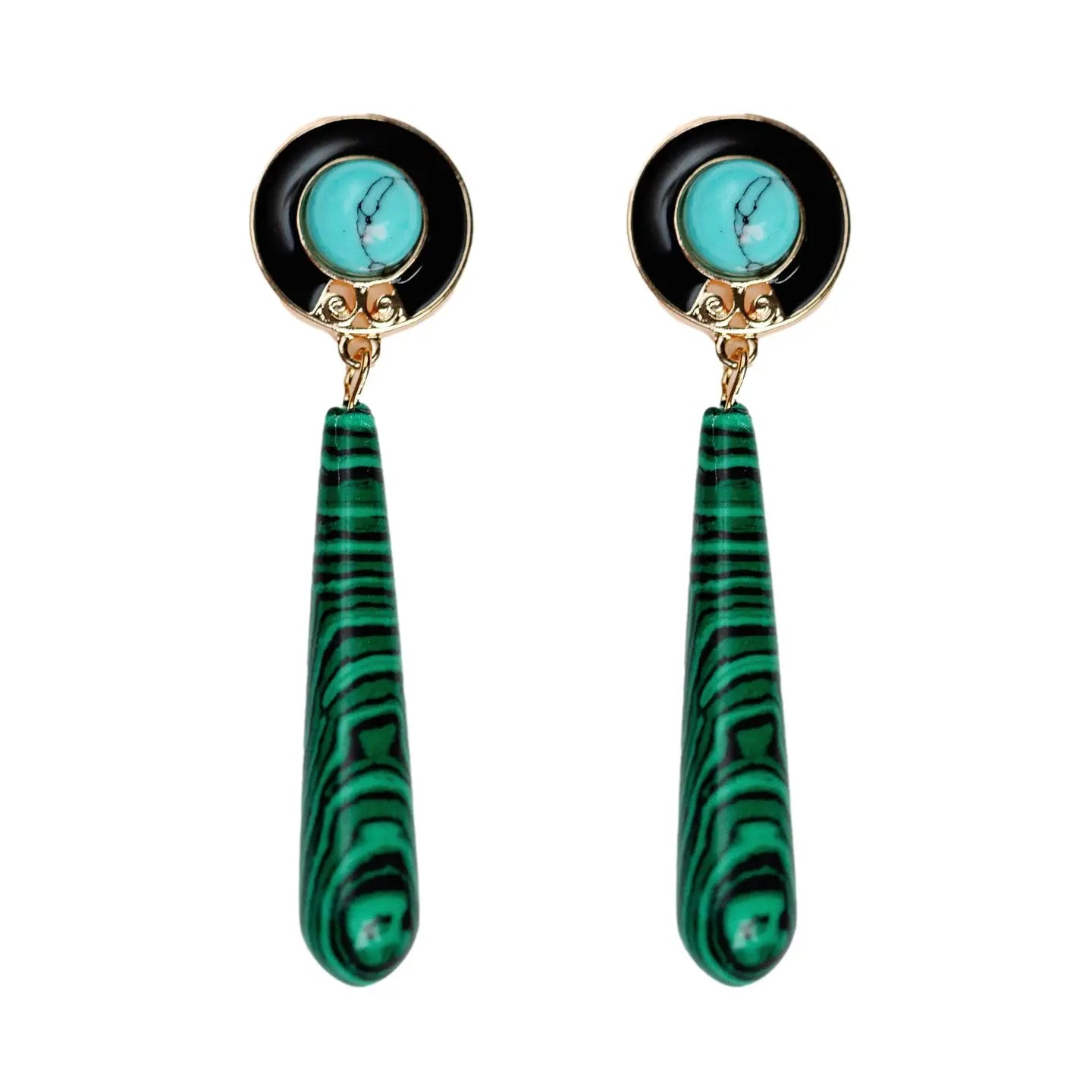 Add a rich pop of color to your look with our custom designed 2.75” Turquoise and Malachite statement earrings. Inspired by our Italian travels, these earrings feature a blue lapis stone surrounded by an enamel circular base paired with a cylindrical custom cut green malachite stone.