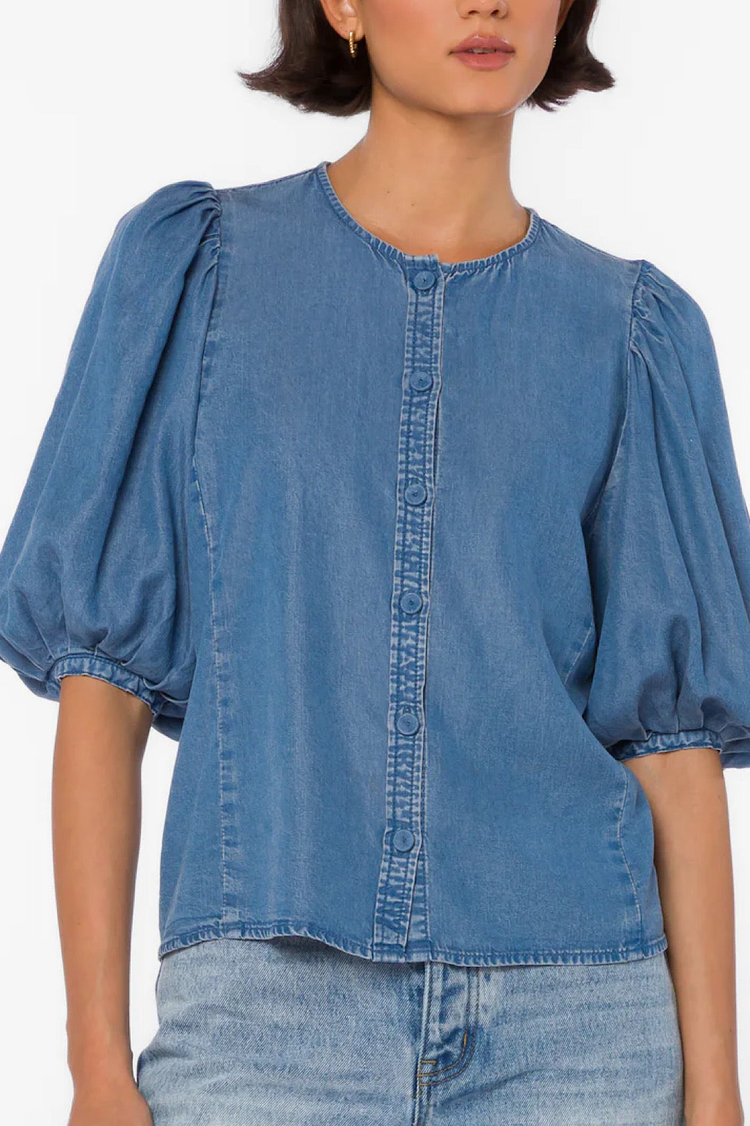 This short puff sleeve button-front blouse features a soft and flowy lightweight drape and an easy, airy feel.