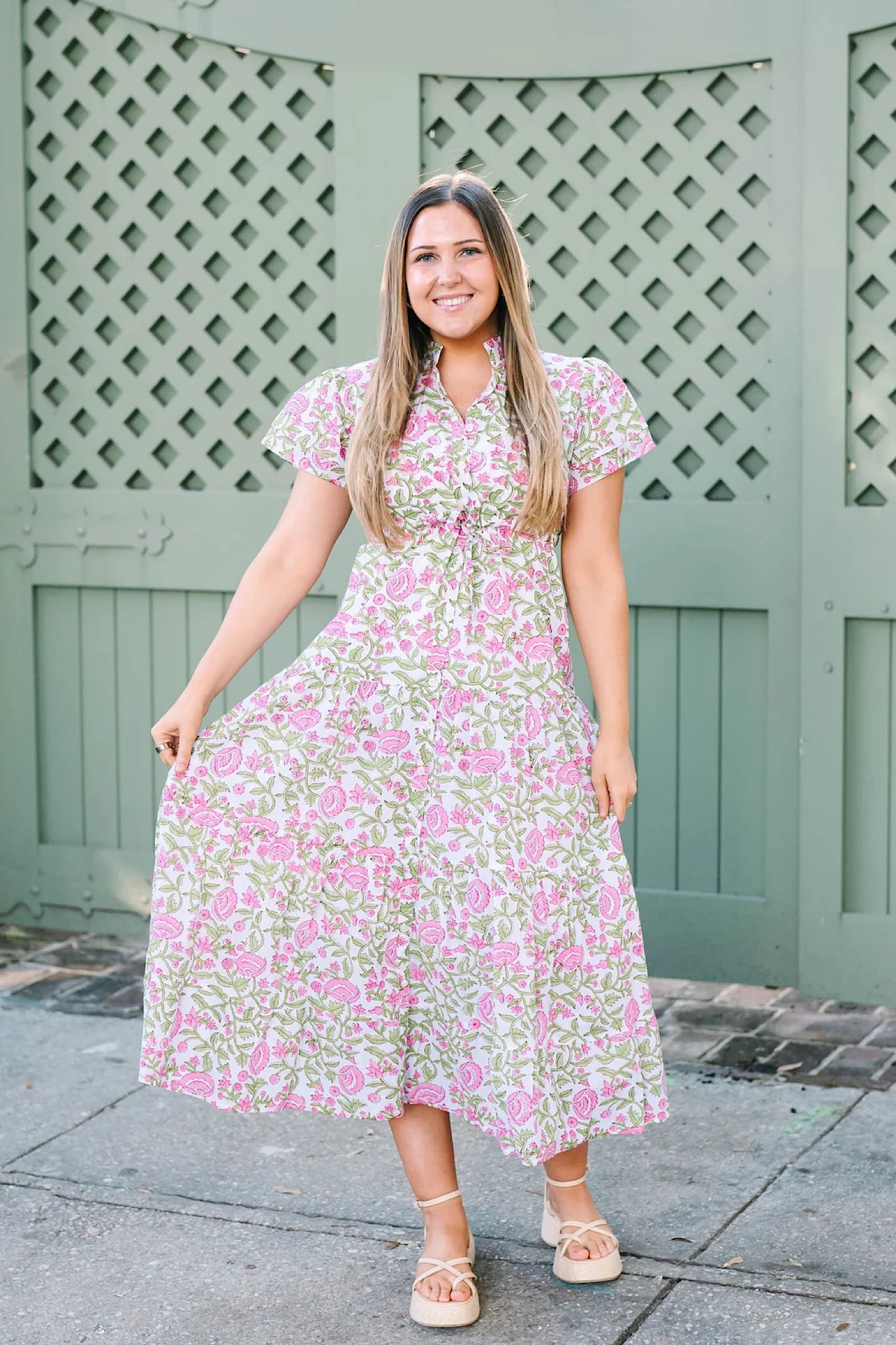 Our Magnolia Flutter Dress was designed after Magnolia Gardens in Charleston. It features a drawstring waist, four-tiered skirts, top-to-bottom contrasting trim, and buttons going upwards from the bottom of the dress to the bust.